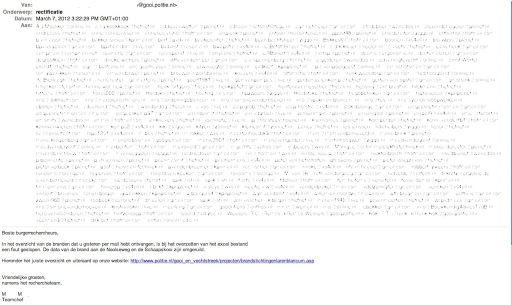 Om 16:32 uur komt deze mail: De rectificatie is per abuis verzonden aan niet afgeschermde emailadressen. Wij bieden hiervoor onze verontschuldigingen aan. In de toekomst zal dit niet weer voorkomen. Namens het brandenteam, D.. van A… .