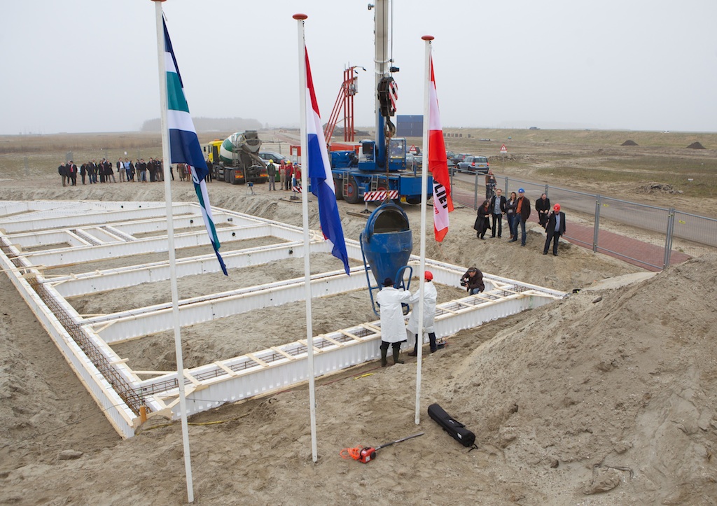 Vanmiddag is in de Blaricummermeent (‘Vierde Kwadrant’) aan de Stichtseweg de bouw van het infocentrum/projectbureau-restaurant officieel van start gegaan. Wethouder Rob Posthumus stortte aan de horecazijde een paar kuubjes beton; het gebouw wordt 1 juli a.s. in gebruik genomen.