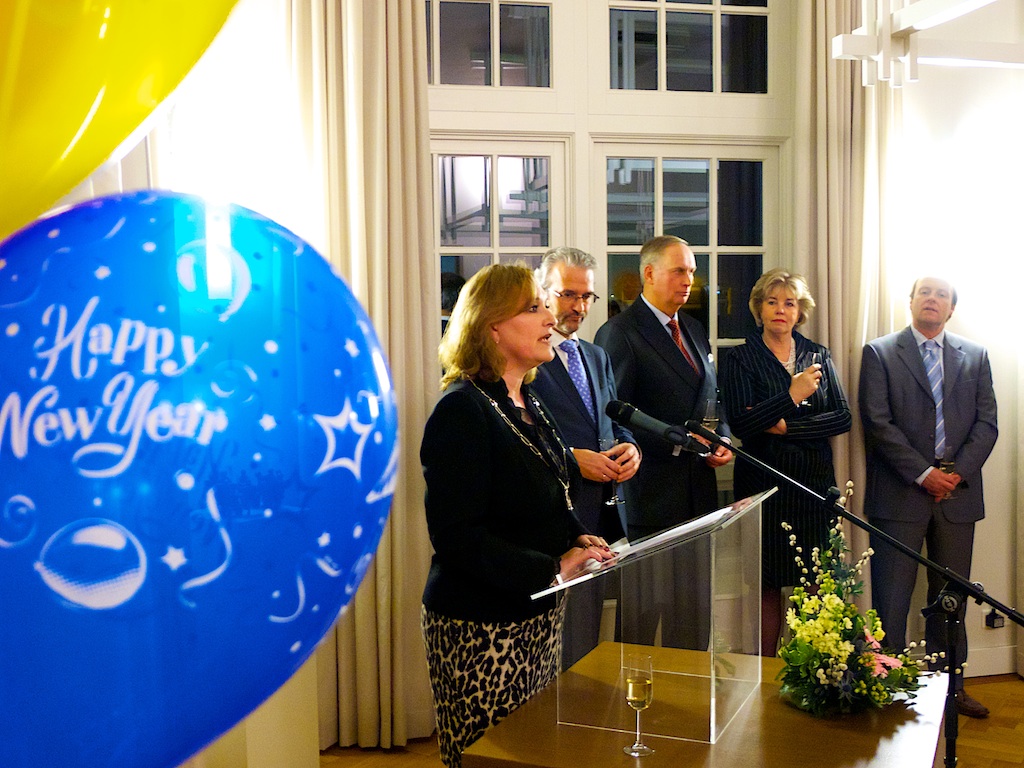 Tijdens de nieuwjaarsreceptie in het gemeentehuis hield burgemeester Joan de Zwart (geflankeerd door de gemeentesecretaris en wethouders) een toespraak en troffen wij onder de aanwezigen ook de nieuwe Blaricummers Thymen, Lucie en de anderhalve maand oude Xander Simons aan (2e foto). Verder zagen wij oud-burgemeester Anneke Le Coultre, oud-wethouder Ben Lüken, de burgemeester van Laren, een stevige deputatie van Brandweer Blaricum, raadsleden, middenstanders, wat gewone burgers, een enkele kunstenaar, good old Jan Heybroek en natuurlijk onszelf. De burgemeester sprak over het (belachelijke dan wel zeer zinvolle) idee van de burgemeesters van Hilversum en Huizen – alle gemeenten in het Gooi samenvoegen tot één gemeente Groot Gooiland – de geruststellende dan wel verontrustende verwachting uit dat voor het eventueel zo ver zal zijn, de kalender wellicht op 2040 zal staan. We gaan het eh … misschien meemaken – Xander in ieder geval wel.