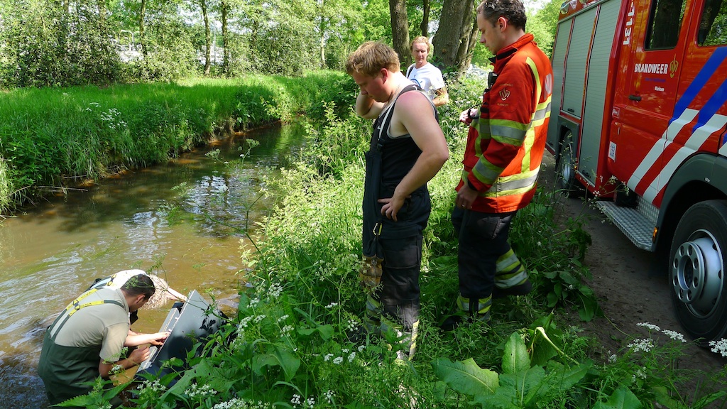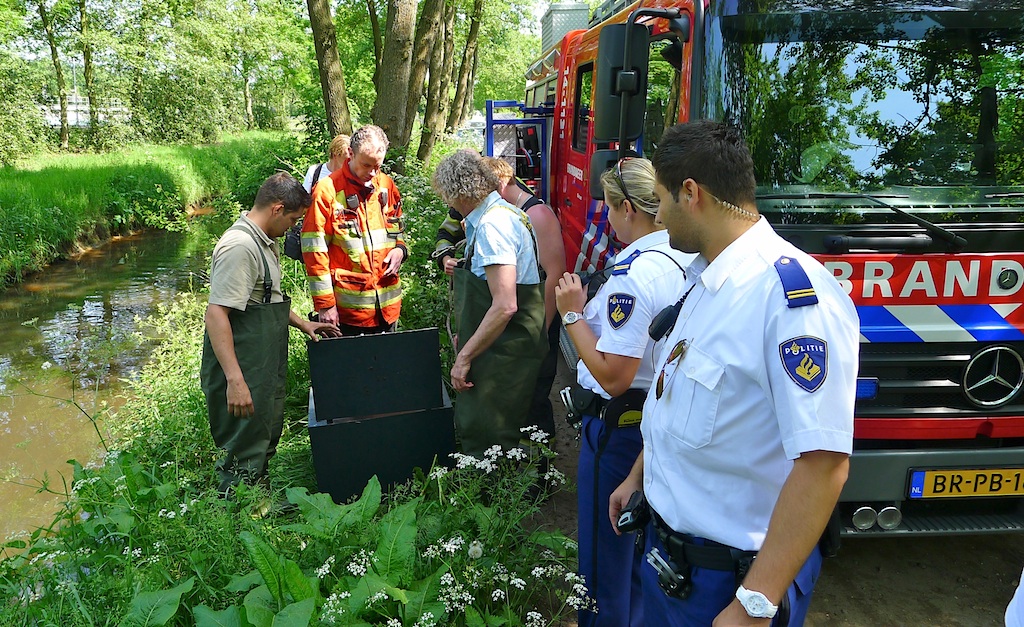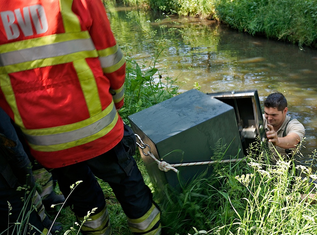 12:00 uur, Gooiergracht: brandweer haalt een opengebroken kluis uit het water.