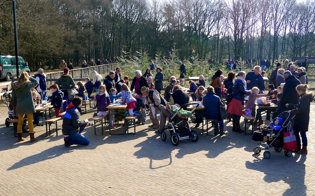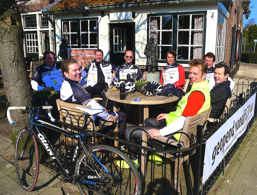 11:05 uur: leden van de lokale wielerclub blazen bij de hoofdsponsor Moeke uit na 70 km in 2,5 uur door de regio.