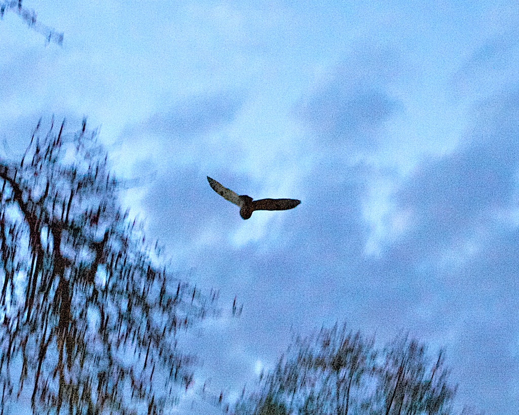 17:35 uur: ransuil net weggevlogen uit de ‘roestboom’ om weer een nachtje op muizenjacht te gaan.