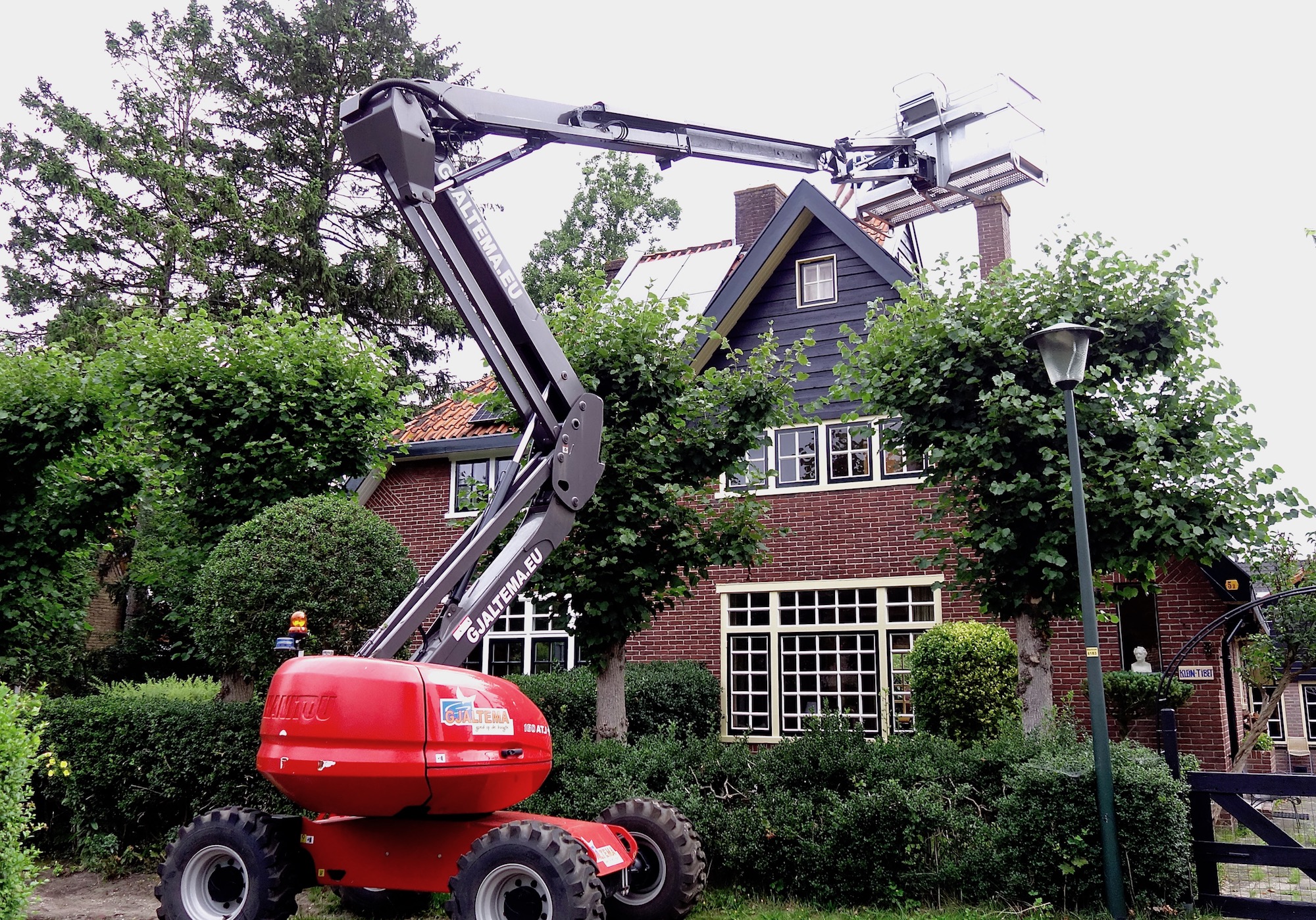 Toevallig (geluk is met de goede) was er een hoogwerker in de buurt, verhuurd door Gjaltema uit Moerdijk.