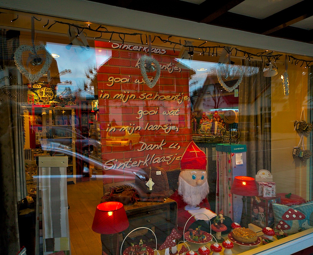 … een Sinterklaas-etalage in het Dorp – bij Wonen & Spelen aan de Huizerweg.