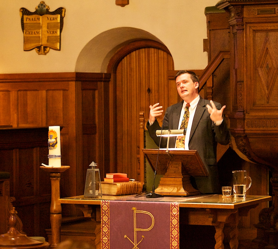 Dr. James Kennedy, hoogleraar Nederlandse geschiedenis sinds de middeleeuwen, hield in het kerkcafé van de Dorpskerk een lezing over onder meer zijn boek Stad op een berg (2010) en ging in op de huidige en toekomstige rol en kansen van de kerk in politiek en samenleving.