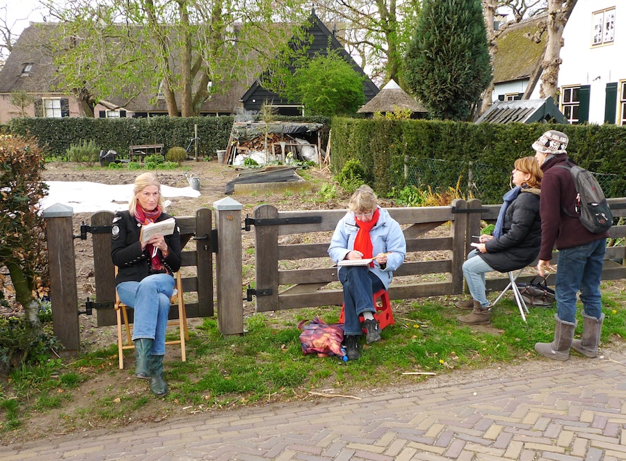 Enkele deelneemsters aan de Volksuniversiteit-cursus ‘Schetsen op reis’ zijn onder toeziend oog (!) van de Loosdrechtse schilderes Joan Lichtenbelt bezig de Angerechtsweg op papier te krijgen.