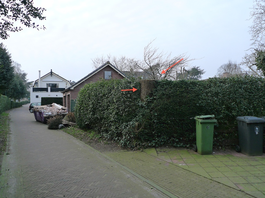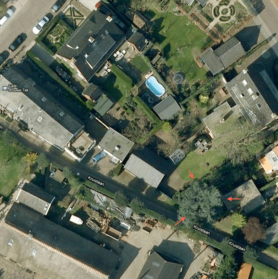 Aan het stille stukje van de Kruislaan (naast d’Ouwe Tak, achterzijde Tweede Molenweg) stond tot begin oktober vorig jaar een majestueuze blauwnaaldige ceder. Het was volgens velen een gezichtsbepalende en ’s nachts ook verhalen vertellende boom, net zoals haar zusters op het schoolplein. Volgens velen ook deed die boom niemand kwaad, maar zo dacht niet iedereen. De boom zou veel zonlicht wegnemen … Wie de eerste foto (dank aan Google Maps) bekijkt en weet dat die foto rond 16:00 uur is genomen, zal al snel tot de conclusie komen dat dat op z’n zachtst gezegd wat overdreven lijkt. Edoch, een kapvergunning werd aangevraagd, de buurt lette niet op (of was het met de executie eens) en de boom is gesneuveld. Met plicht tot herplant, dat wel. Daar wachten we op – en wensen onze nazaten veel plezier van de opvolger én vooral ook meer liefde en wijsheid als de opvolger haar armen wat (te) wijd gaat spreiden. Niet kappen, maar zorgvuldig terugsnoeien is een betere oplossing. En als men van heel veel zon en niet van bomen houdt: de lokale makelaars zullen ongetwijfeld in een of ander Sahara Resort nog wel een stekkie kunnen vinden.