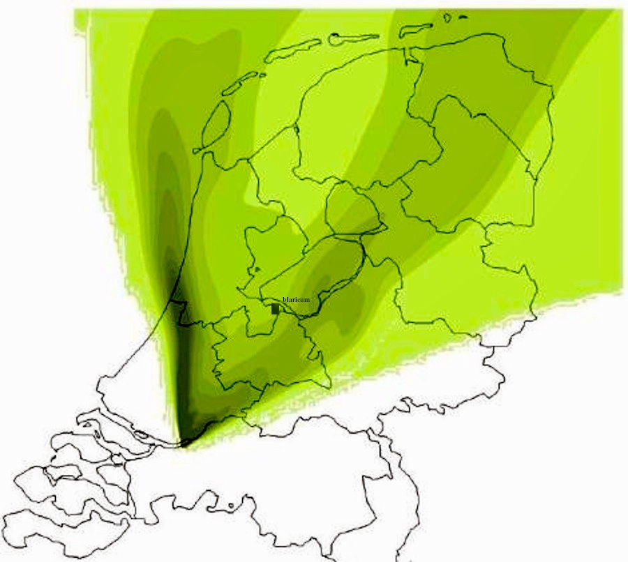 De rookpluim (met mogelijke deeltjesneerslag). Bron: Rapport BOT-mi (RIVM-afdeling).