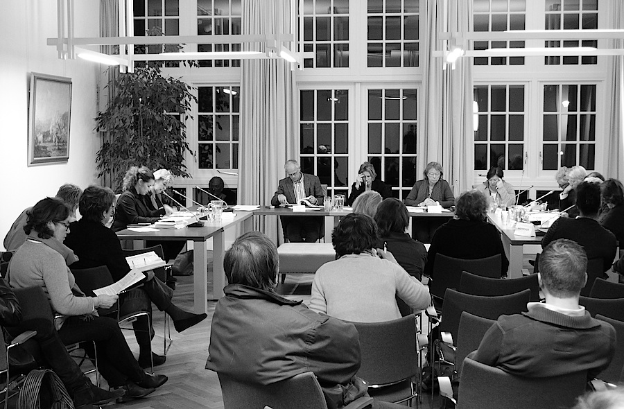 Ronde Tafel-gesprek in gemeentehuis over bestemmingsplannen, precariorechten op kabels en wi-fi in het gemeentehuis.