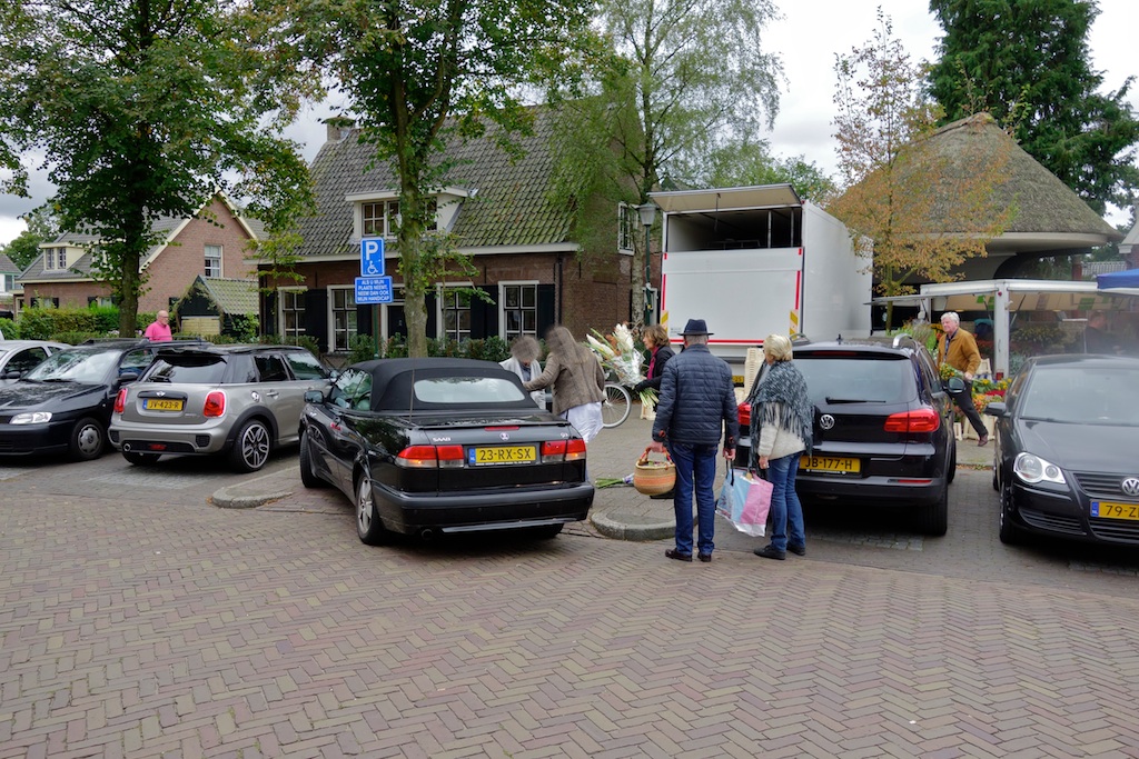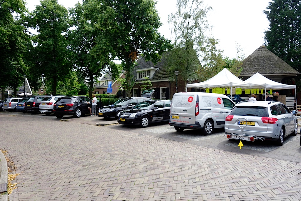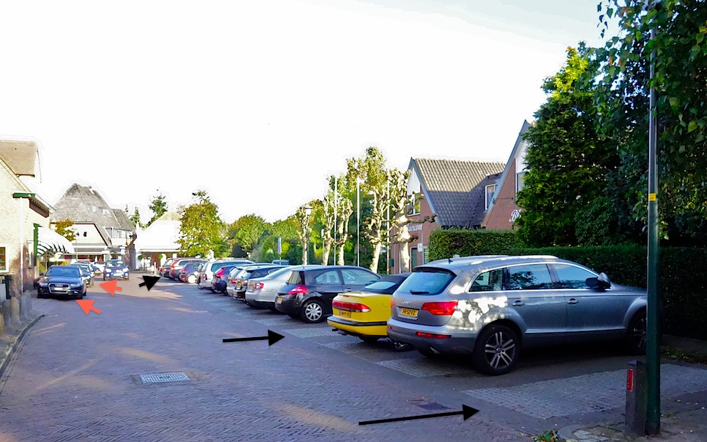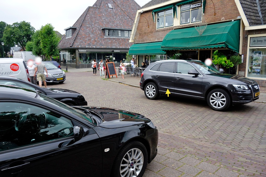 Dorpsstraat, 15:30 uur: een Audi komt de straat ‘binnenvliegen’ (omschrijving van getuige) en schampt de fietsenstandaard van een stilstaande of net een beetje uitparkerende Renault of zoiets. Kwestie van te hard rijden en niet opletten en van pech – de bestuurster van de Audi ‘is zich een hoedje geschrokken’ – dat ze overigens niet op had. Beide auto’s hebben een beetje schade, dus enige administratie is noodzakelijk. De Audi wordt (zonder kaart) op de invalidenplaats gezet. Diverse passanten (‘participanten van deze configuratie in de openbare ruimte’ – op z’n sociologisch gezegd) wijzen de bestuurster erop dat dat niet mag. Oog ook. En dan komen ze: