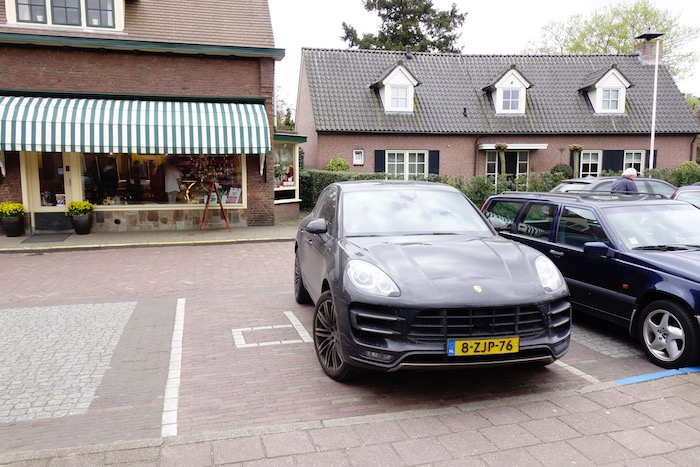 … zo’n flapdrol-Porsche op de stoep (terwijl er overal vrije plekken zijn – wat was ook alweer het probleem …?), …