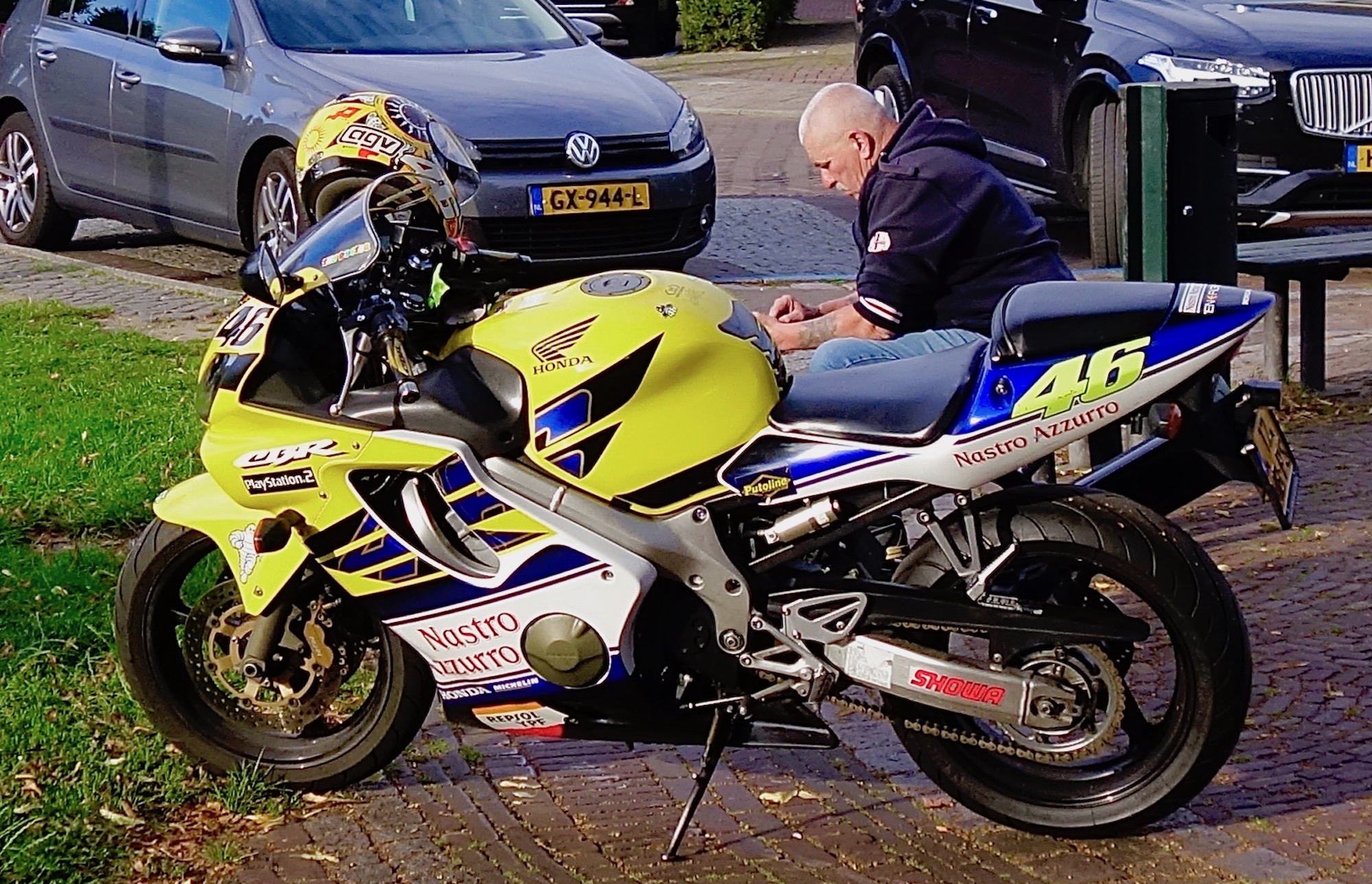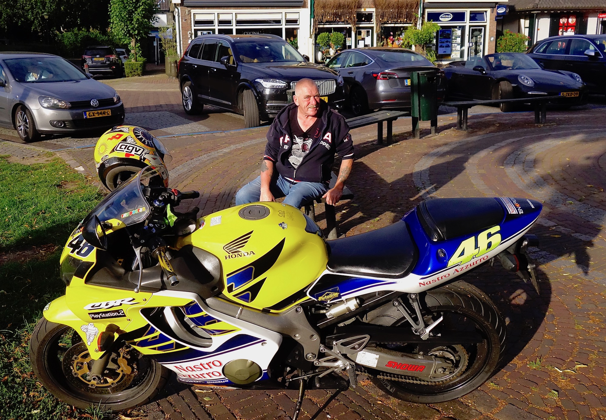‘Honda. Een van de 500 kopieën van die van Valentino Rossi. 280, 240 ooit zelf gedaan.’