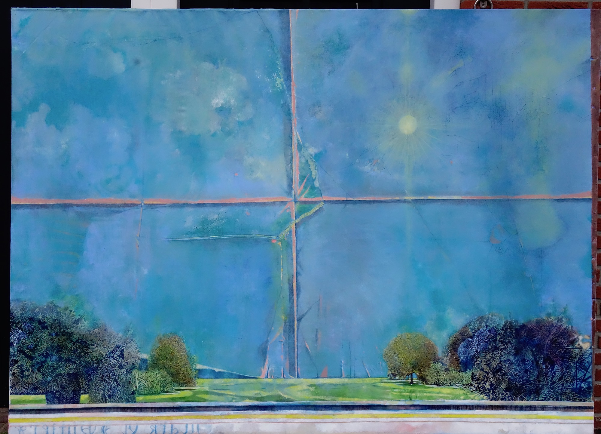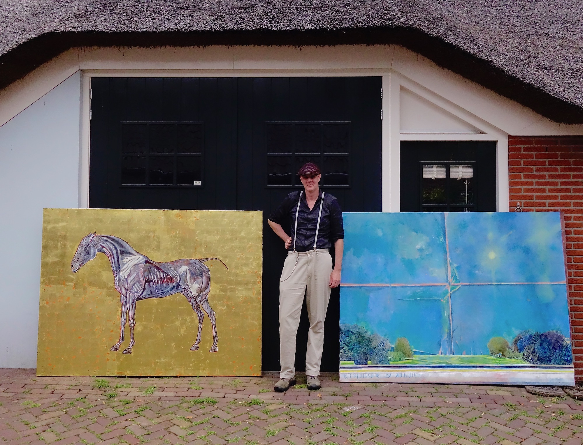 Kunstschilder Mark Outjers met twee van zijn favoriete kunstwerken – te koop. Info bij de Vos-pomp.