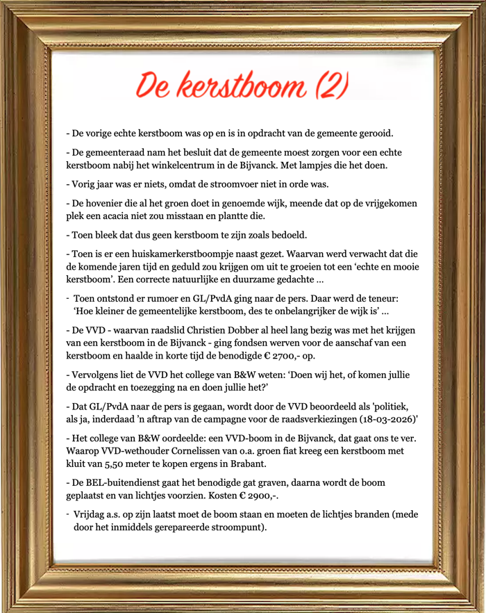 Kennelijk is, met een sneu aandoende eenzijdigheid, de campagne voor de raadsverkiezingen van 18 maart 2026 in de Bijvanck van start gegaan. Energiebron is de (?) gemeentelijke kerstboom die naar de smaak van een aantal wijkbewoners wat aan de kleine kant is. Een regiokrant is erbij gekomen, foto gemaakt en wat ronkende tekst gepubliceerd. ‘Bijvanck achtergesteld gebied!, Bijvanck ondergeschoven kindje.’ En vanuit het college van B&W is gemeld dat er een boom van 5 meter (hoogte) is gevonden.