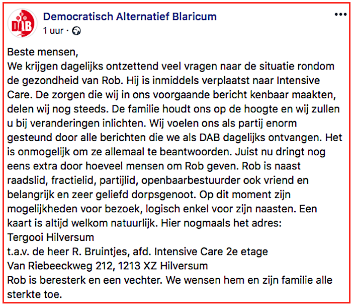 Dorpsgenoten (119 & 120): Bianca en Britt.Na een bezoekje aan Rob Bruintjes in Tergooi Hilversum is de conclusie ‘Die is diep gegaan,maar bezig weer op te klauteren.’ De weg van verder herstel zal lang zijn, de toekomst ongewis, maar de communicatie is weer helder, de humor terug, de vechtlust onverminderd. Wordt positief en met voorzichtig optimisme vervolgd.