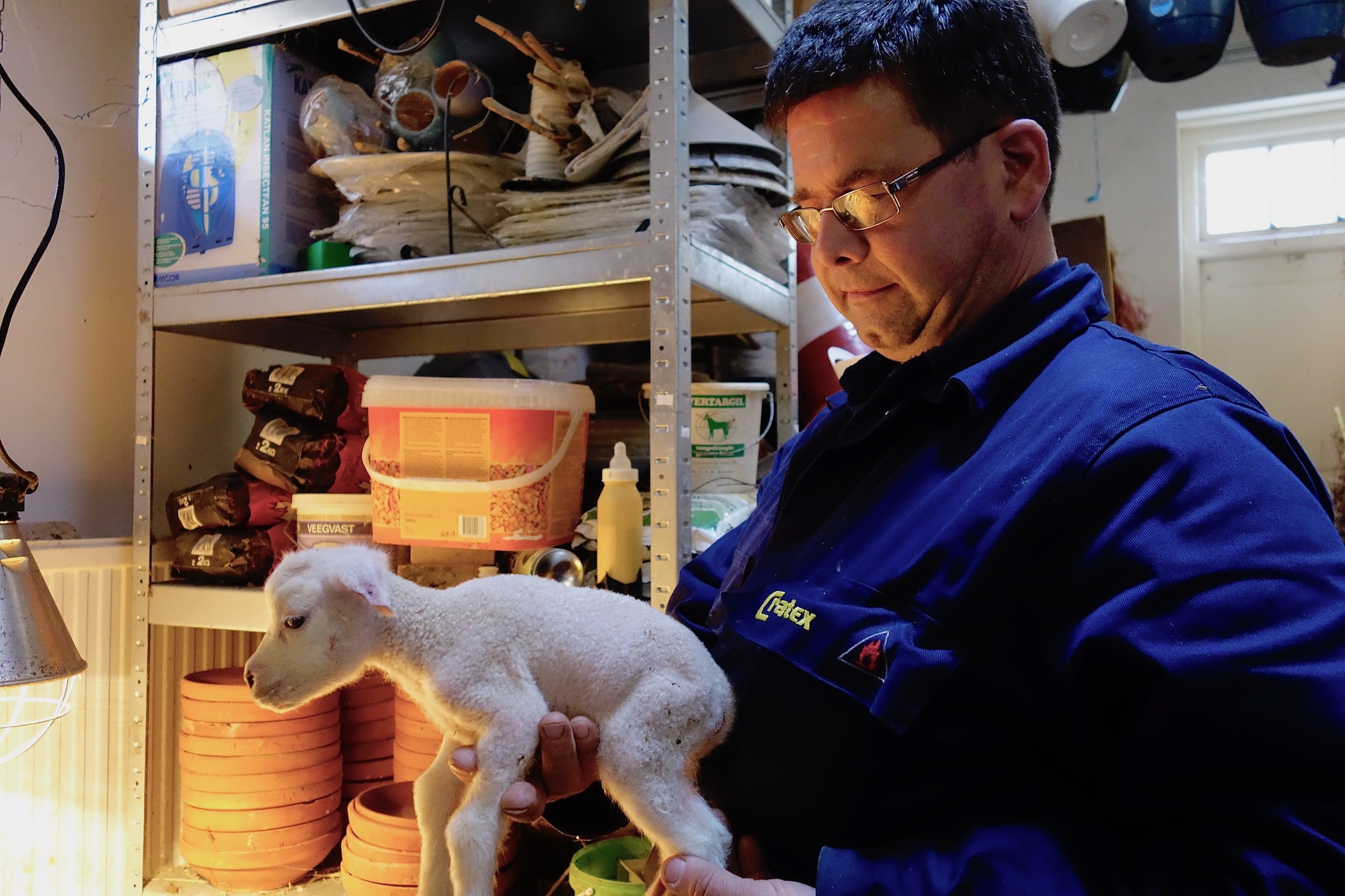 Lam gisterenavond geboren. Lambert: ‘Ma trok ’t niet. Dan maar onder de lamp. Weekje of zes met de fles voeren en dan kan ‘ie bij het andere spul.’ En waar zijn de lammetjes gebleven? ‘Die staan sinds vrijdag op de Meentzoom. En binnen liggen nu zo’n 20 schapen die binnenkort moeten. ‘k Ben nog wel even bezig.’