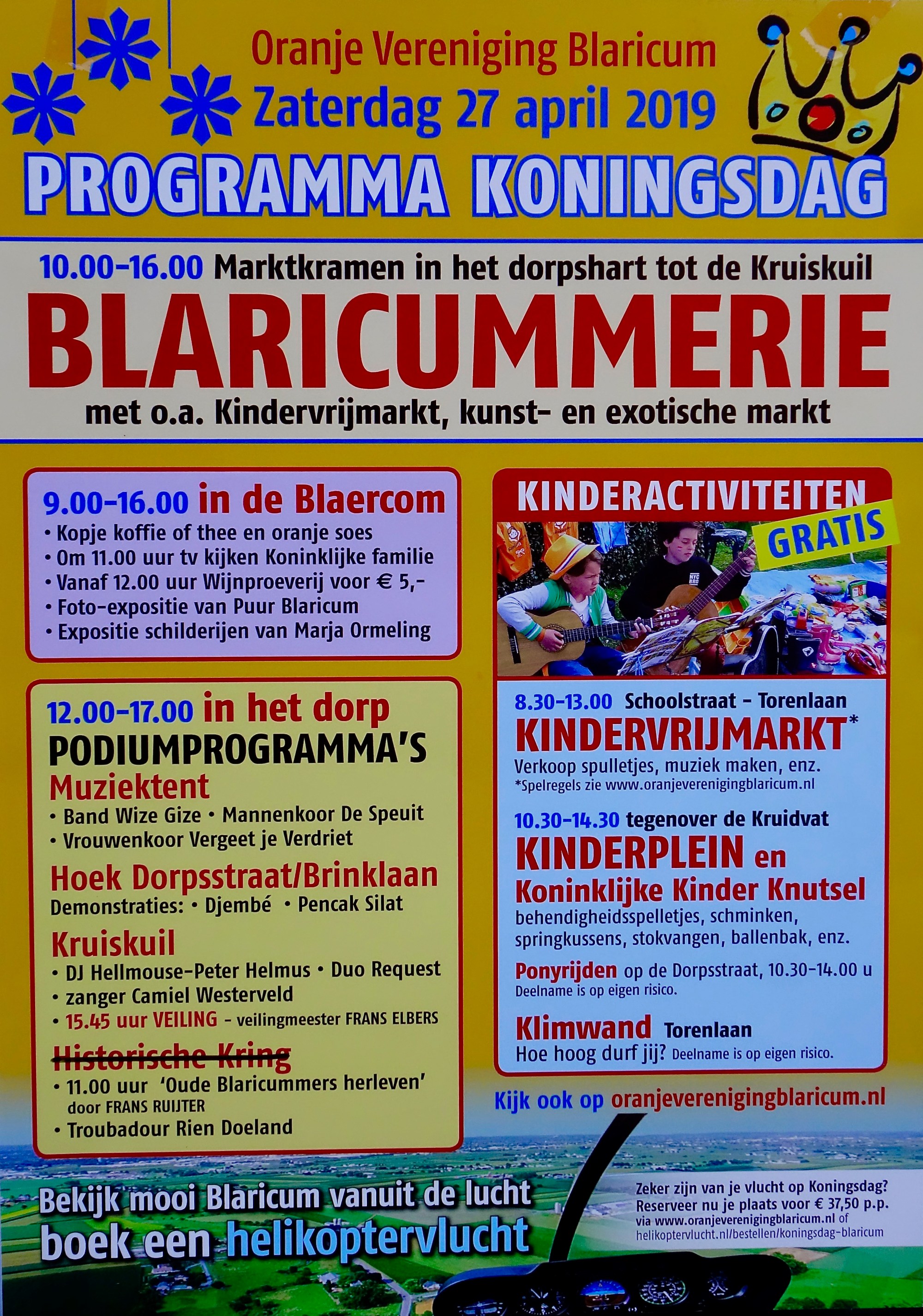 - Op woensdagmiddag v.a. 12:00 uur ringsteken ongezadeld, aanspanningen keuren en ringsteken plus ringsteken bakfietsen op de Kerklaan; voetbaltoernooi op BVV; Solexen vanaf Kruiskuil