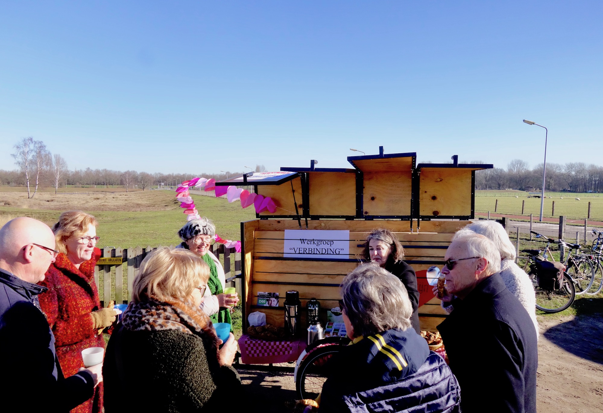 Le Coultredreef, 11 uur: D66 zette op de parkeerplaats halverwege de dreef een pop-up koffie- en theekar neer en nodigde de Verbinding-werkgroep uit. Reden: het initiatief van deze werkgroep om de verbinding tussen Dorp en Bijvanck/Meent in meerdere opzichten te verbeteren, is onlangs door de gemeenteraad om zeep geholpen. Als alternatief voor de bekende Valentijnstaart (blijk van waardering van politieke partijen voor constructieve maatschappelijke initiatieven) nam D66 het initiatief de werkgroep een bakkie ‘troost’ met bijbehorende lekkernijen aan te bieden. En passant bleek dat de locatie in kwestie een prima stek is om er een bescheiden koffie- en theehuisje te realiseren. Als een soort sociale sluis zeg maar … die dan wél wordt gebruikt – en minder kost.