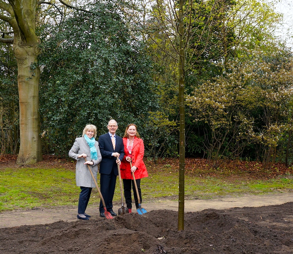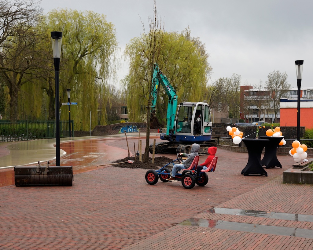 Vanochtend heeft het (vooralsnog) blijvende gedeelte van het college van burgemeester en wethouder(s) op zowel het Burgemeester Tydemanplein als in het (Wethouder) Pieperspark een koningslinde geplant. Ondanks het regenachtige en koude weer was de publieke belangstelling aanmerkelijk. Assistentie bij deze basale vorm van arbeid kregen de beide collegedames De Zwart (rood jakje) en de De Joode van niemand minder dan Oranje Vereniging-voorzitter Peter Smit, die overigens niet erg schopvast bleek te zijn – maar wel een fijn pak aan had. Linde nummer 3 wordt waarschijnlijk volgend jaar op Koningsdag geplant op het nog te realiseren Lindeplein in de Blaricummer Meent. Wellicht zal tegen die tijd het college van B&W ook weer tot in volledigheid zijn aangeplant. De lindes zullen op korte termijn worden voorzien van afgrenzende gietijzeren hekwerkjes, die tegen een mooie scherpe prijs worden gemaakt door Smederij Van den Bergh.