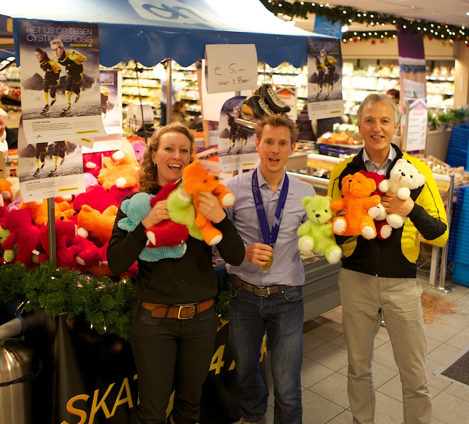 Marieke, Jochem en Roel verkopen beren voor Skate4air, de goede-doelorganisatie die geld probeert op te halen dat zal worden besteed aan onderzoek voor de levensbedreigende taaislijmziekte. U kunt de ‘berenverkopers’ ook sponsoren met hun poging op 1 februari op de Oostenrijkse Weissensee de Alternatieve Elfstedentocht (200 km) te schaatsen. Klik op het logo rechtsboven.