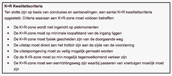 Hieruit valt te concluderen dat de K+R-strook niet voldoet aan vijf van de zeven criteria. Belangrijkste is wel dat de locatie in feite ongeschikt is voor een K+R-strook.