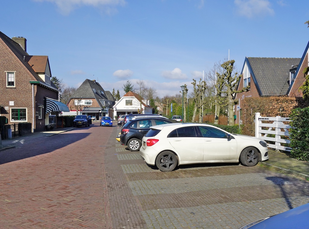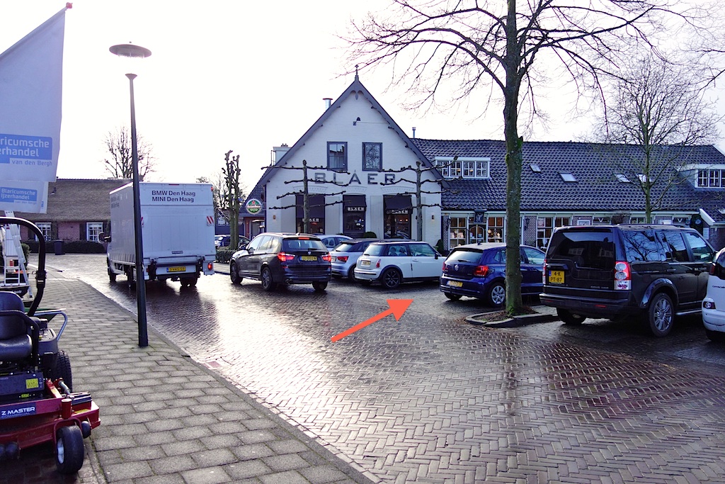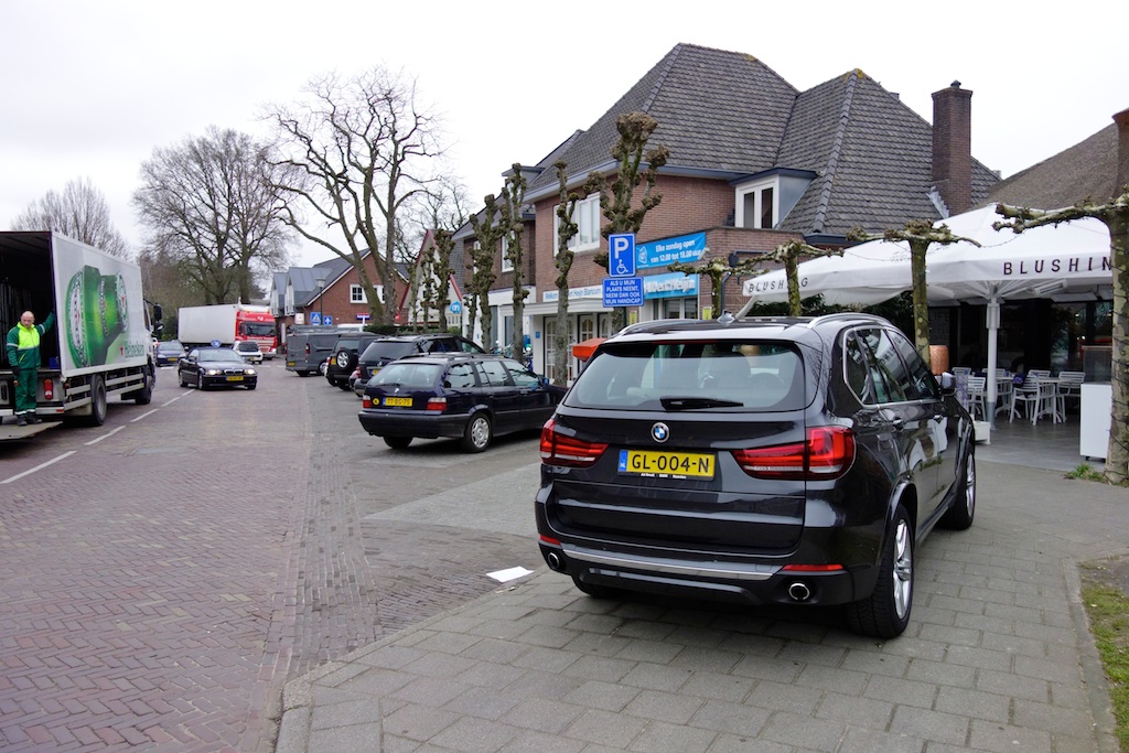De dame in de auto (autodame) staat met twee wielen op de stoep, strak tegen de heg. Kan geen ochtendblad tussen.
