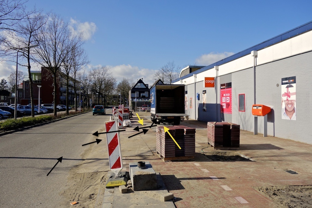 ook in een rolstoel) bij een andere stoepparkeerder ‘eromheen’ ging, bijna door een rijbaangebruiker platgereden.