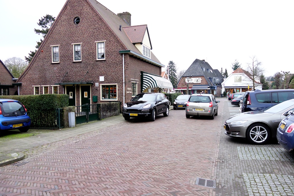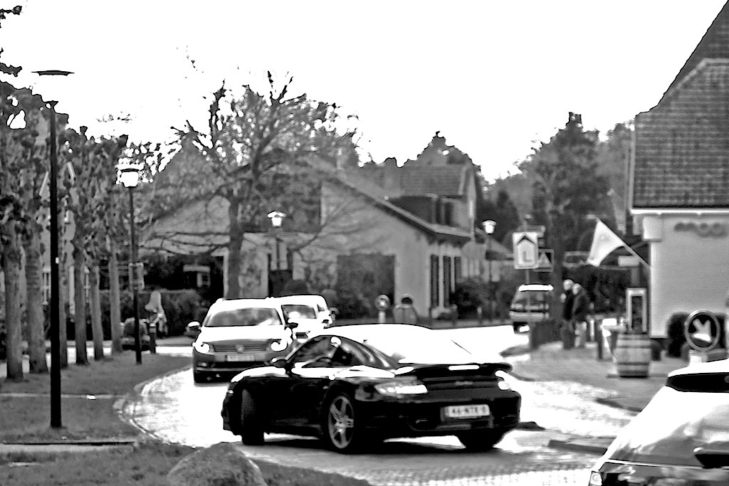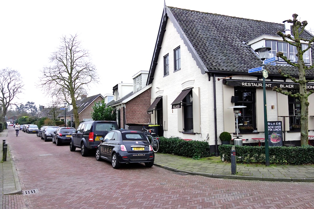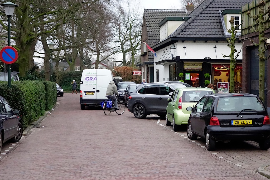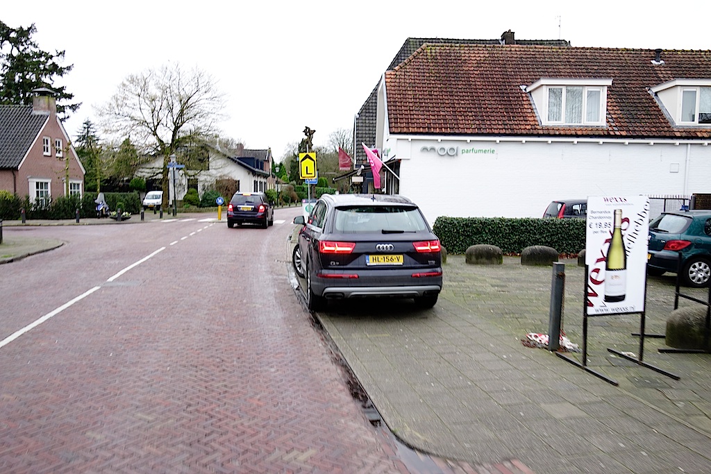 Over Dorpsstraat aan komen blazen, sportief linksaf Torenlaan op – strak aan de linkerkant van de verkeersgeleider bij de drankwinkel de stoep op steken – paar doosjes wijn in het vooronder – dan soepel achteruit en kont direct richting Meentweg en denken dat er weer links van de verkeersgeleider richting Laren kan worden weggereden (foto) – dat kan niet door het tegemoetkomende verkeer (dat zich wel aan de regels houdt) – dus sukkelig achteruit het kruispunt Torenlaan/Dorpsstraat op en sportief/strak/soepel aan de goede kant van de verkeersgeleider wegblazen. Zal wel rijbewijs van Mars hebben.