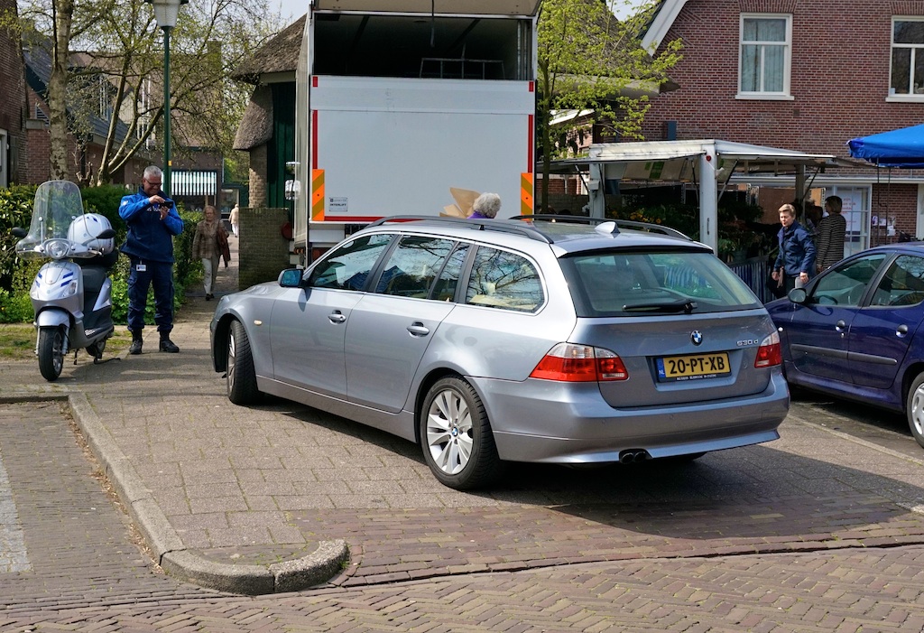 … om een auto (de ‘rechte’) strak (‘parallel’) tegen de gebogen stoeprand (de ‘kromme’, ook wel bocht genaamd) te plaatsen. Het nutteloze van de parkeerontmoedigende paaltjes wordt tegelijkertijd aangetoond – het nut(teloze) van de discussie over het moreel verval eveneens.