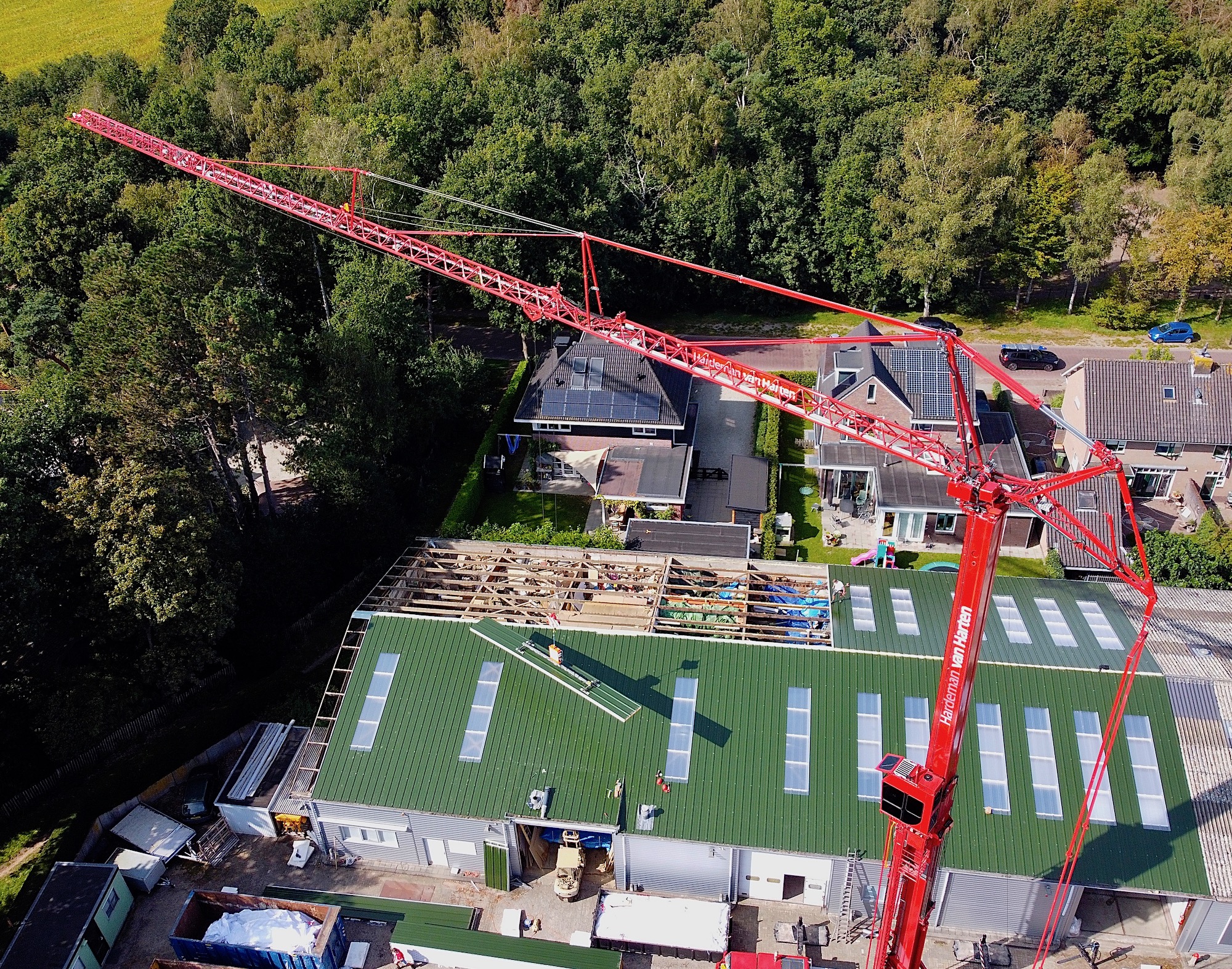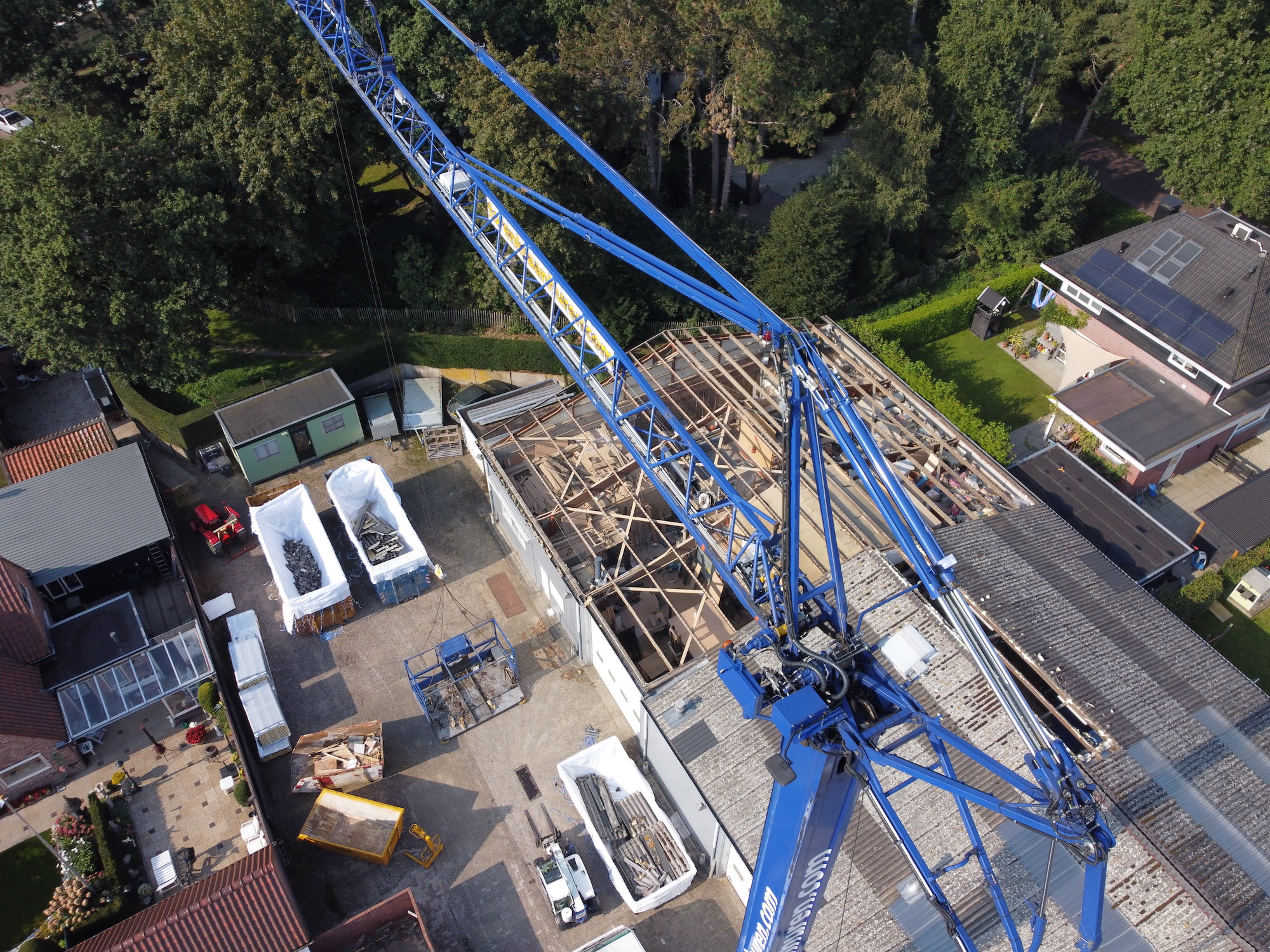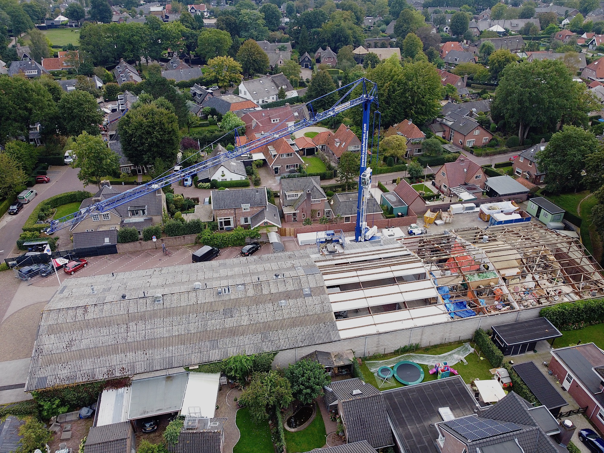 Van der Heiden krijgt een nieuw dak. De cementplaten van circa 10 jaar oud begonnen (alweer) te lekken. Nu komt er staal op, met aan de binnenkant een isolatielaag. Morgenmiddag klaar. De kraan is 30 meter hoog.
