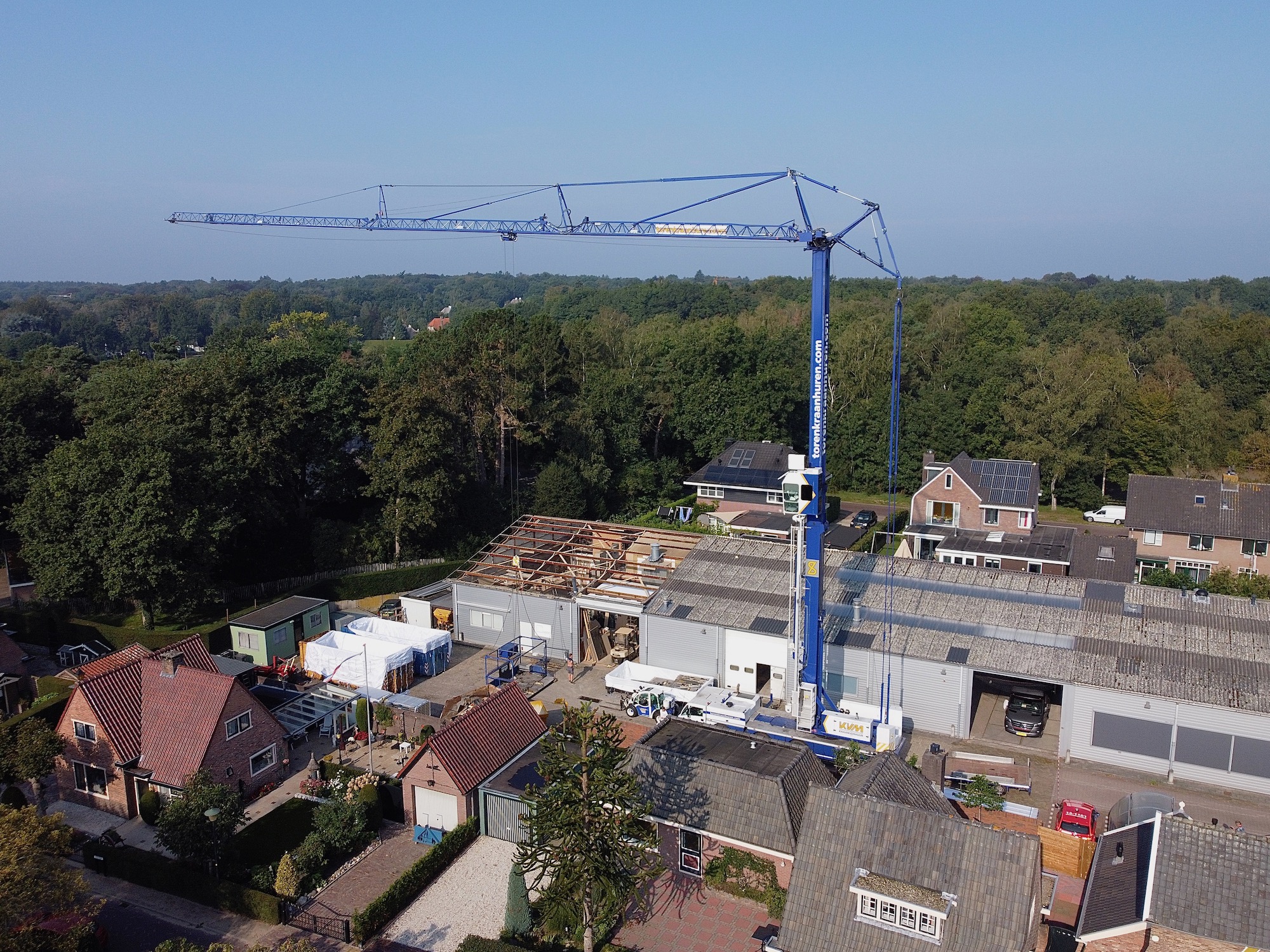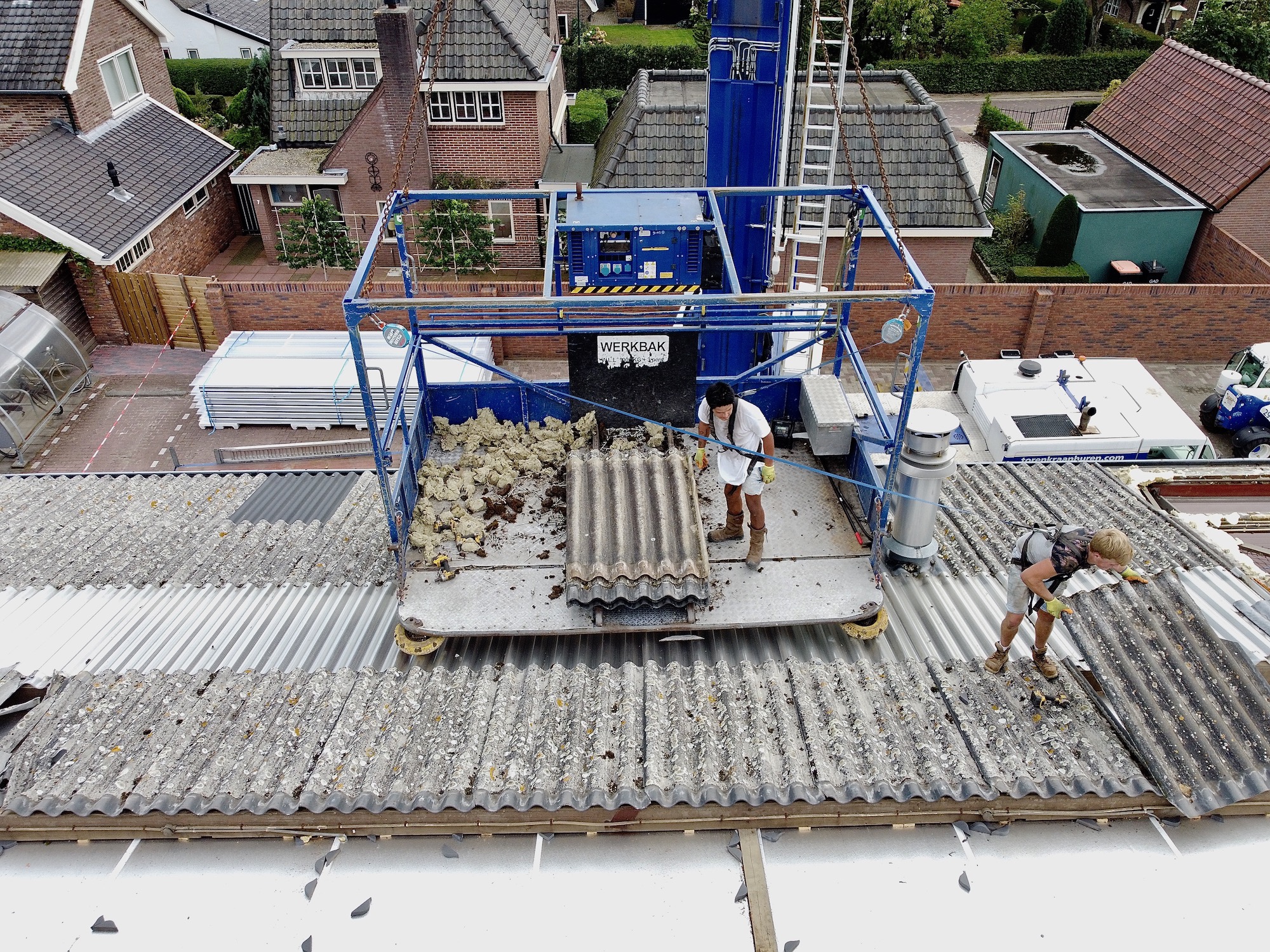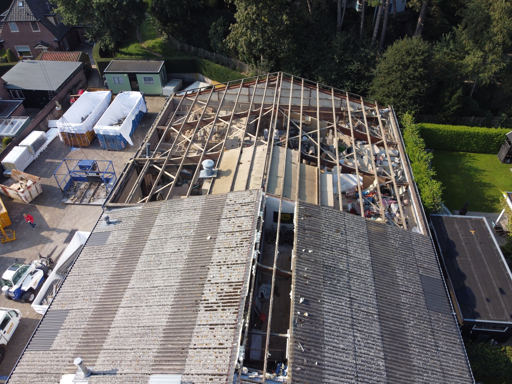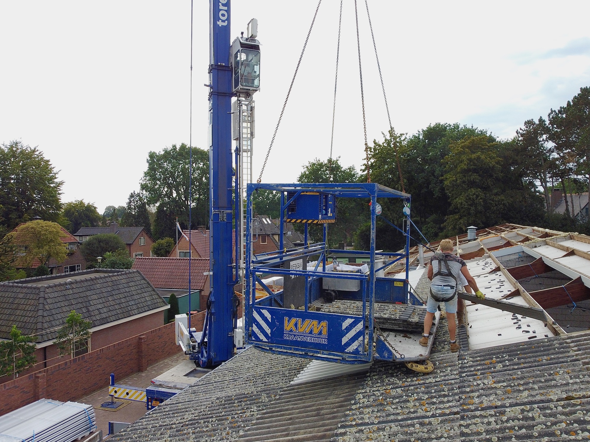 Van der Heiden krijgt een nieuw dak. De cementplaten van circa 10 jaar oud begonnen (alweer) te lekken. Nu komt er staal op, met aan de binnenkant een isolatielaag. Morgenmiddag klaar. De kraan is 30 meter hoog.